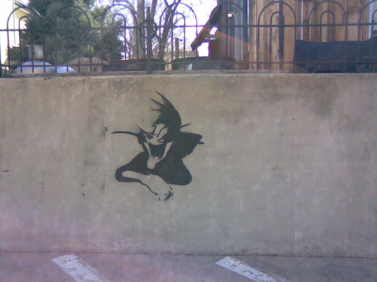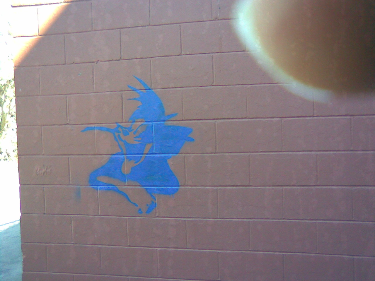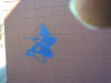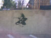 Just what could these graffiti tags mean? It is obvious that they are stencils from the stray paint around them. One possibility is that this is a gang symbol, but do gangs use children's cartoons? It also may be some form of guerilla marketing. If so, what are they trying to sell? I will not buy any. Companies using graffiti as advertising is offensive. It may be the handiwork of kids who think they are funny. I am not laughing! It is certainly not the work of an artist. Any idiot can slap a stencil on a wall and spray paint on it. That requires no talent. This is defacement; nothing more.