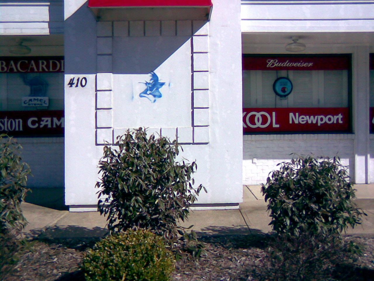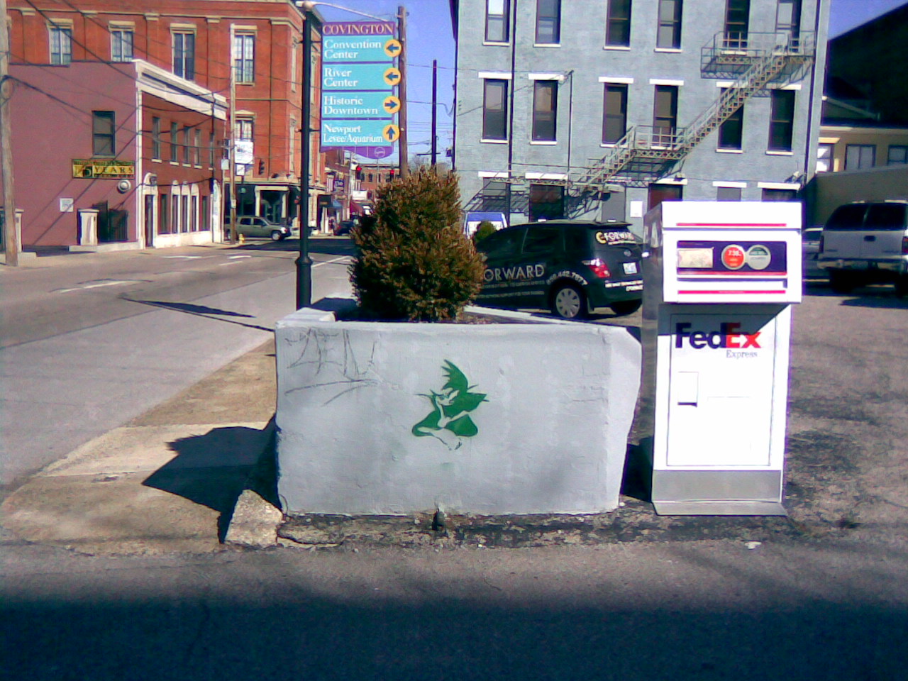 It seemed to be a few weeks before I saw any more, but three have popped up in rapid succession. There is a blue one that appears to be the same size behind a recently closed chili parlor on Fifth Street, a smaller blue one on the front of a tobacco store on Philadelphia Street, and a small green one on a planter in front of the federal courthouse.